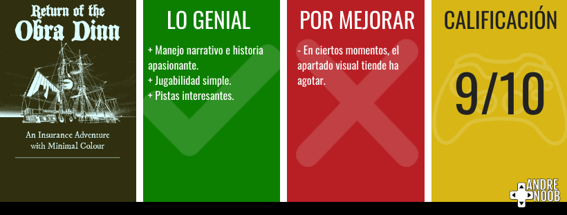 Return of the Obra Dinn es un videojuego de lógica e investigación, que aprovecha la nostalgia de las expediciones marítimas del siglo XIX con el matiz de los videojuegos de los primeros ordenadores, dando al jugador una experiencia que vale la pena reseñar.