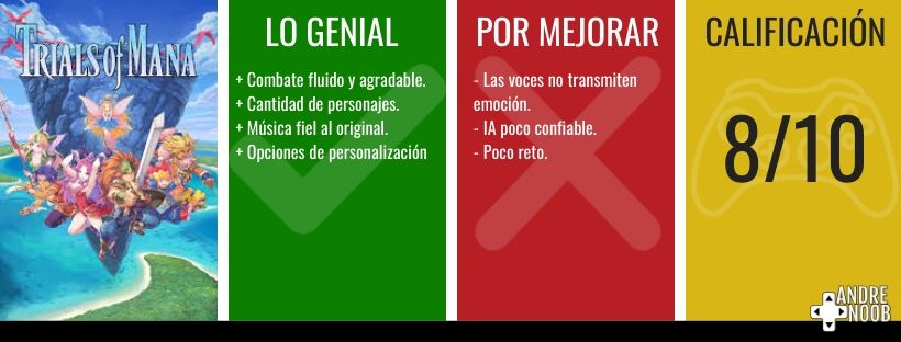 Concluyendo, este es un gran remake que conserva todo lo necesario del espíritu de los juegos de Mana, una agradable sorpresa de parte de Square-Enix, que por fin parece haber encontrado la forma de hacer grandes remakes.