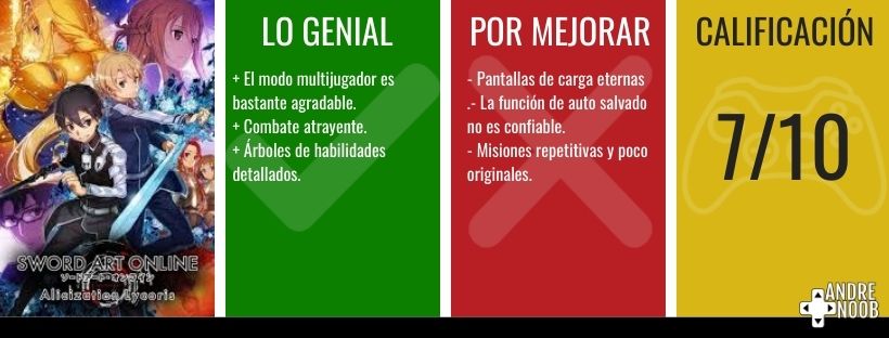 Los personajes tienen gran profundidad y crecimiento, pero después de un par de capítulos vuelve a ser solo fan fiction, el personaje principal puede ser personalizado, pero en las escenas siempre será Kirito.
