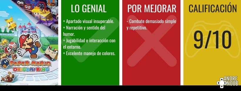 En resumen, Paper Mario: The Origami King es un juego completamente interesante y muy divertido, capaz de sorprender, asombrar y encantar a cualquier tipo de jugador, con momentos memorables y una jugabilidad sencilla, que hace que el viaje en el mundo de papel valga la pena.