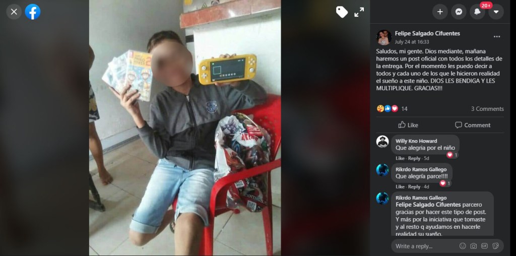 Esta historia comenzó semanas atrás, cuando el administrador Felipe Salgado Cifuentes, hizo un llamado al grupo con el fin de ayudar al pequeño, quien había manifestado su amor por Switch en varias publicaciones y también su interés en adquirir una, pero debido a la difícil situación económica que atraviesa el mundo y su familia, no podía.