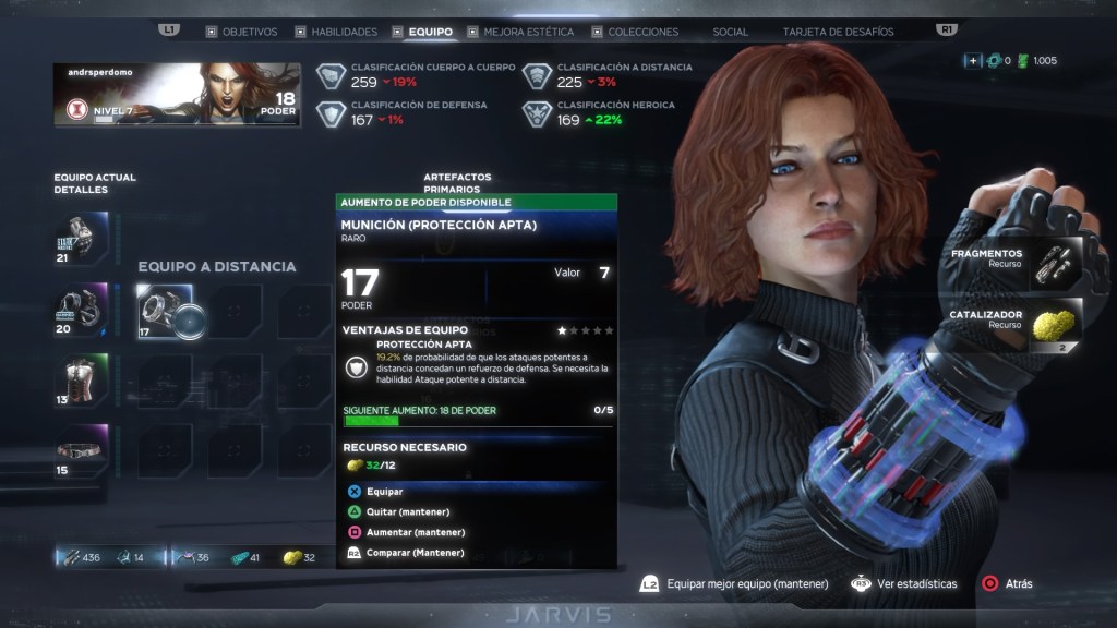 Cada misión de Marvel’s Avengers cuenta con una serie de objetivos y requerimiento de poder, siendo este último el que nos dirá que tan aptos estamos preparados para una misión. Para aumentar este poder, haremos uso de las piezas de equipo, que a diferencia de otros juegos del género, no cambiará visualmente a nuestro personaje, dejando que su estética radique en el skin que queramos usar.