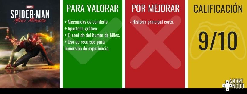 En resumen, Marvel’s Spider-Man: Miles Morales es un videojuego digno de su franquicia. Capaz de llevar al jugador a una nueva aventura en la ciudad de Nueva York y hacerle sentir que puede ser un héroe, sin importar los golpes de la vida y capaz de dar lo mejor en cada momento. Una experiencia única que sirve de cruce entre la vieja y la nueva generación. Un excelente juego para navidad.