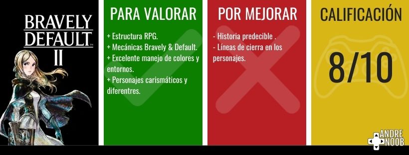 Por todo lo demás, Bravely Default II es un título lleno de sorpresas, buenos momentos y fácil de jugar. Capaz de ofrecer un centenar de horas al verdadero explorador y una buena aventura a quienes gustan de los títulos con buen desarrollo de personajes. Donde podremos crecer con ellos en cada nuevo destino y ver como la búsqueda de los cristales, es algo que nos quedará en el corazón. Obligado para todos los amantes de los RPG.