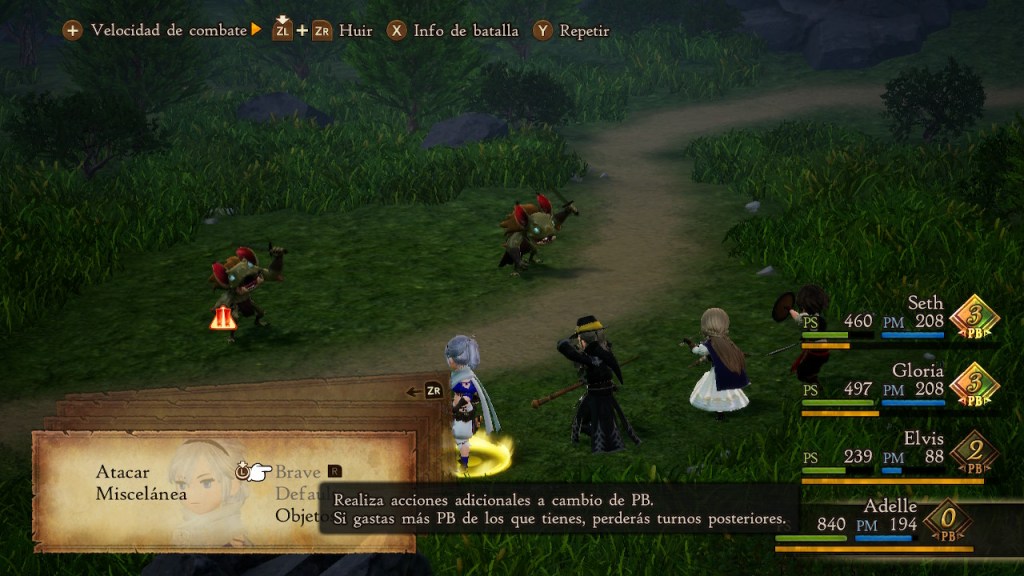 Un ejemplo de esto es cuando estamos enfrentando un enemigo que es débil contra las dagas y tiene poca salud. Seth es quien normalmente utiliza esta arma y para evitar no extender el combate más turnos usaremos Bravely dos veces. Lo que le dará dos oportunidades más de ataque a nuestro personaje y que en esos tres movimientos, acabe con el enemigo.