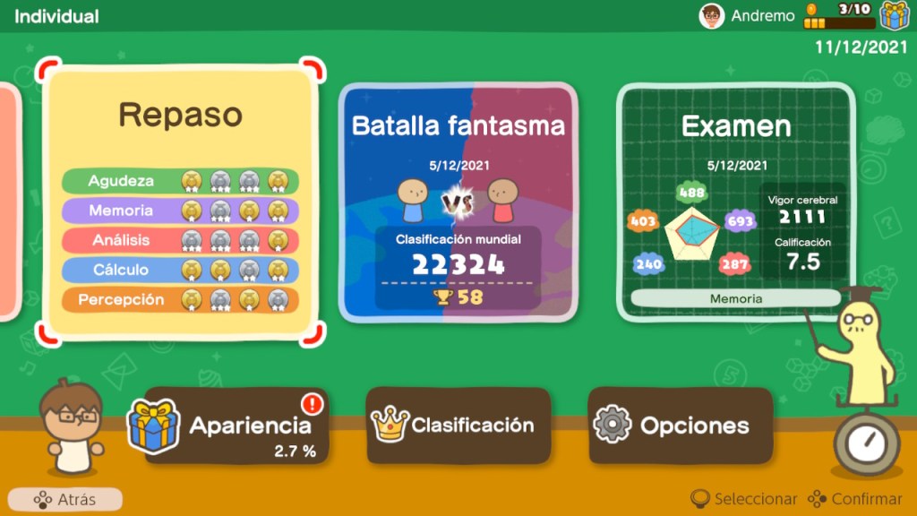Al ingresar en el juego, el sistema nos pedirá algunos de nuestros datos personales para categorizar nuestra actividad en las pruebas que realizaremos. Estas se dividen en dos grandes factores: el modo individual y el modo fiesta. La primera esta diseñada para que repasemos nuestros conocimientos y ejercitemos nuestro pensamiento por diferentes actividades, la segunda es para jugar con amigos y familia desde la misma consola.