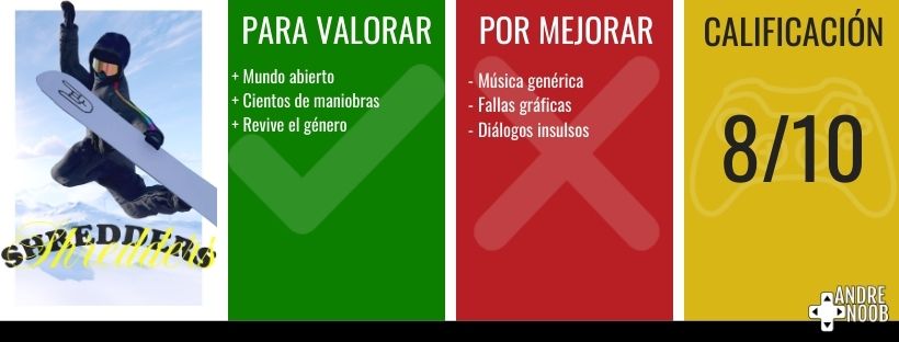 Además de ello la idea de un mundo abierto por recorrer con nuestra tabla de nieve es muy interesante, la idea de poder avanzar y ver que hay más allá es continua y no es opresiva, sabemos que nos enfrentaremos con nuevos retos pero tenemos confianza en poder superarlos, en este aspecto el juego es muy pródigo, ya que la curva de aprendizaje es estable y no frena al jugador con obstáculos insuperables.