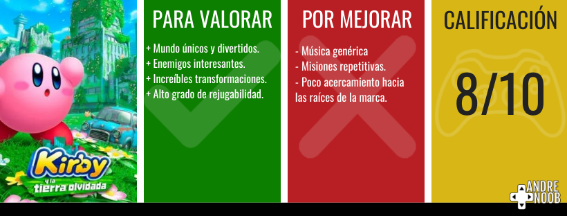 Kirby Y La Tierra Olvidada es un juego que viene a demostrar la importancia del personaje para La Gran N, enseñándonos a todos los que no somos muy cercanos a él, la magia que lo ha convertido en uno de los favoritos de la compañía.