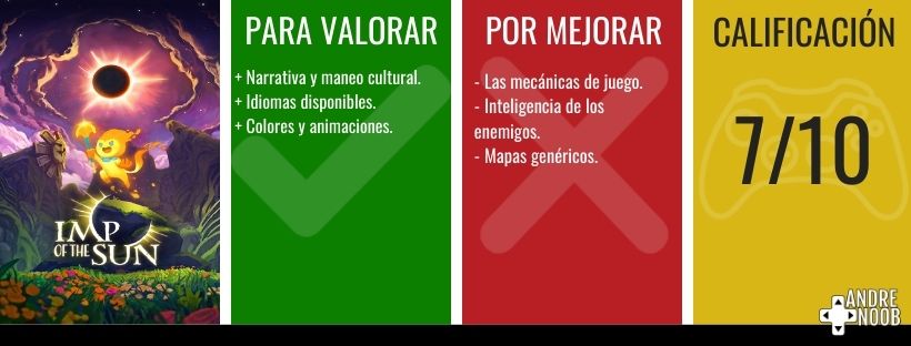 En resumen, Imp of the Sun es un juego bonito, con una historia apasionante y hecho con mucho amor, pero que no ofrece nada nuevo para el género. Así que sí quieres darle una probada, vale la pena darle oportunidad.