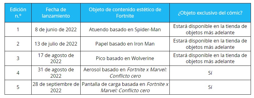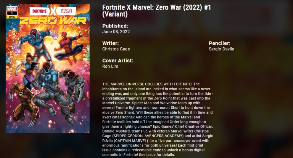 Es una nueva serie de comics creados entre Marvel y Epic Games. Al igual que la serie Batman X Fortnite, aquí cada uno de los comics tendrá una recompensa, la cual podrá ser canjeada por el usuario en la tienda de Epic.