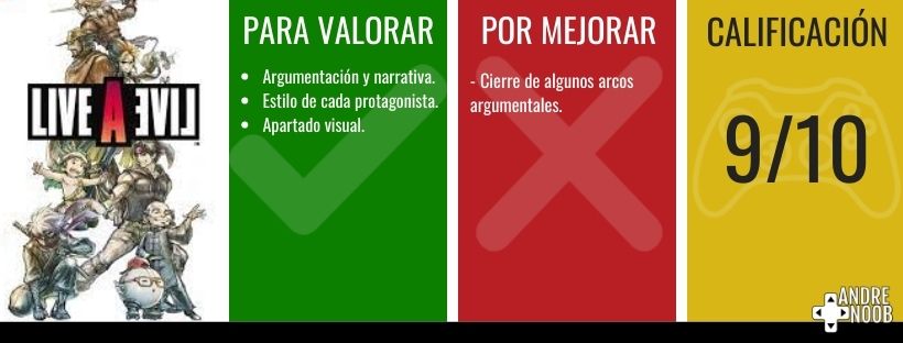 Live A Live es un título capaz de entregar diferentes sensaciones al jugador. Cada una de ellas ligada a la historia que está contando y enfocada en la idea que quiere transmitir al jugador. Logrando ofrecer una experiencia única en todos los sentidos.