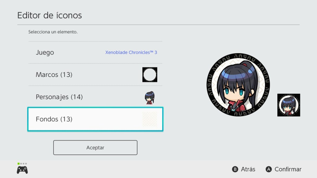 En esta nueva pestaña veremos la información más relevante: el juego al que pertenece, los marcos, los personajes y los fondos que tenemos de este título. Ingresamos en cada uno de estos apartados, usaremos lo que tenemos disponible y al final le daremos ‘aceptar’.