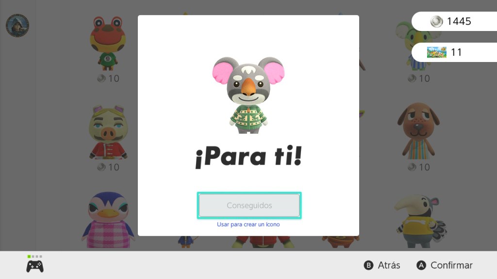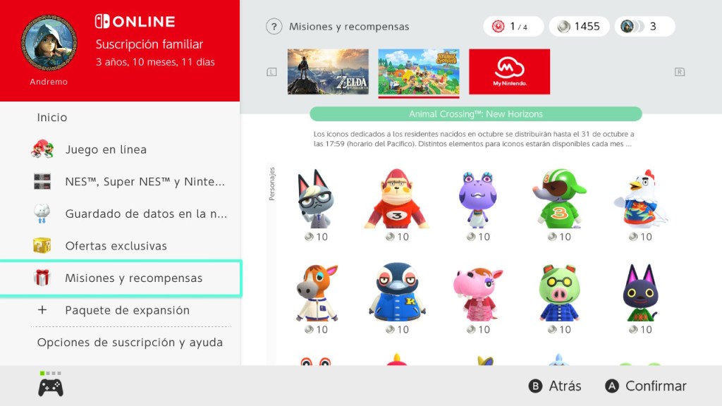 En la sección de recompensas podremos cambiar nuestros puntos plata por algún avatar, marco y fondo. Los juegos suelen variar entre exclusivos de Nintendo, como sucede con The Legend of Zelda y Super Mario Bros. En este ejemplo usaremos personajes de Animal Crossing: New Horizons.