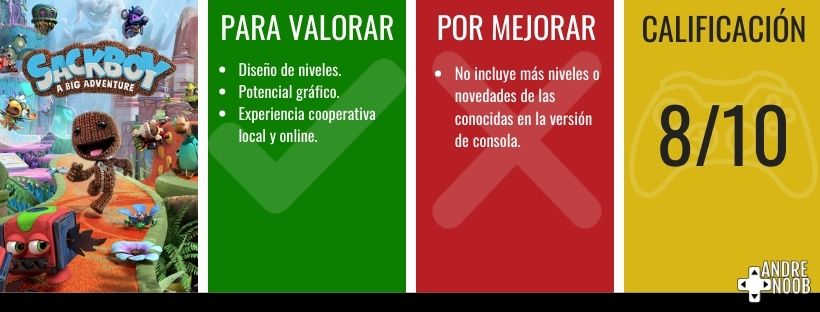 Sackboy: A Big Adventure en PC es entretenido, divertido y relajante. Entregando a los jugadores de ordenador un título de plataformas diferente y con mucho por explorar. Capaz de entregar muchas de diversión por medio de la rejugabilidad de sus niveles con jugadores mediante internet o de forma local.