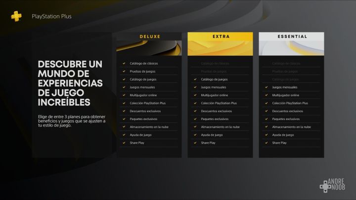 El plan más completo y ofrece todos los beneficios del plan Extra más algunos exclusivos. Entre los contenidos que incluye están las pruebas de juegos, que permiten probar una selección de los títulos más importantes con límite de tiempo para ayudar a decidir la próxima compra; el catálogo de clásicos, que incluye cientos de juegos de las consolas PlayStation original, PS2 y PSP; y la ayuda de juego, que ofrece consejos e indicaciones para superar los desafíos más difíciles.