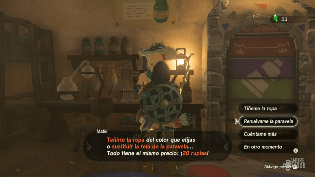 Luego de conseguir una tela, ya sea con Amiibo o no, tendremos que dirigirnos a la Aldea Hatelia. En ella tendremos que llegar hasta la tienda del sastre que cambia de color la ropa y hablar con él.