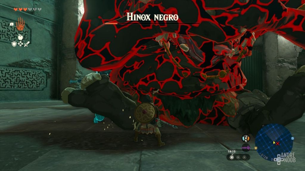 En subsuelo nos vamos hacia el punto indicado arriba hasta llegar a un coliseo. Al arribar al sitio, tendremos que entrar y enfrentarnos a un Hinox Negro. El punto débil de este monstruo está en sus pies, por ello tendrás que apostarle al daño en esta zona y romper su defensa de madera.