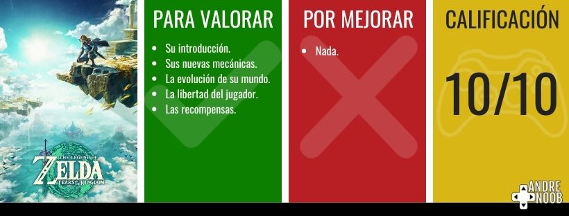 En resumen, The Legend of Zelda: Tears of the Kingdom es una aventura que supera su propia y trasciende sobre sí misma. Haciendo uso de su primera aventura cómo el punto de partida para lo que quiere ser, una experiencia única y personal. Que servirá de puntos de inspiración. Superando el concepto de una obra maestra del gaming y creando un nuevo nivel.