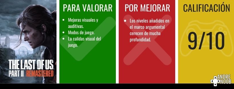 En conclusión, The Last of Us: Part II Remastered es la experiencia más humana y personal de PlayStation 5, permitiendo al jugador vivir cada segundo de este viaje como jamás imagino. Haciendo de la obra de arte que fue el juego original, una verdadera experiencia de nueva generación. Que hace parte de la historia cada uno de nosotros, enseñándonos o mostrándonos algo que no vimos anteriormente.
