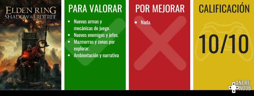 Elden Ring: Shadow of the Erdtree es una obra de arte en todos los sentidos y el mejor trabajo de From Software hasta la fecha. Esta expansión está llena de sorpresas, de lugares por conocer y de retos por enfrentar. Dejándote la lección más importante: que si te derrotan, puedes levantarte de nuevo y volver a intentar. Así que date la oportunidad de disfrutar de este viaje, porque vale la pena.