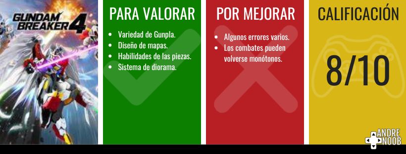 En resumen, Gundam Breaker 4 es un juego diseñado para los fanáticos y los conocedores del mundo de los Mobile Suit. Entregando horas de diversión y combates interesantes, mientras se arma el Gunpla de los sueños. Algo que puede parecer algo imposible, pero que aquí se hace real.