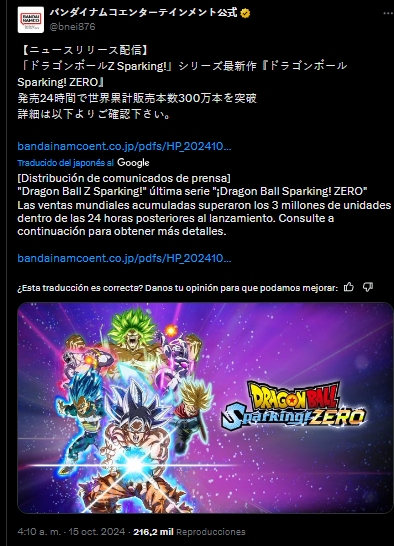 Dragon Ball: Sparking Zero es un éxito y ha superado los 3 millones de copias vendidas en su fin de semana de lanzamiento. Siendo el título de Dragon Ball mejor vendido hasta la fecha.