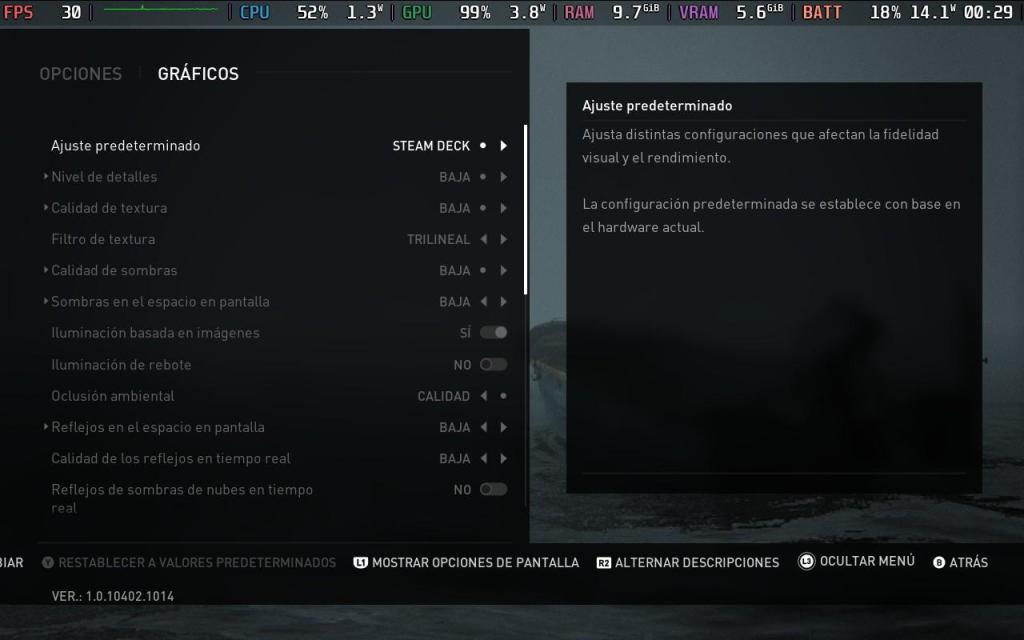 Aunque si quieres modificarla y hacer una configuración diferente, puedes hacerlo. Esto te permitirá usar 60 FPS en vez de 30 y acercarte más a la experiencia de PS5. Esto debido al buen uso que se le da a la tecnología de FSR de AMD. Siendo uno de los mejores juegos adaptados hasta la fecha con esta mejora.