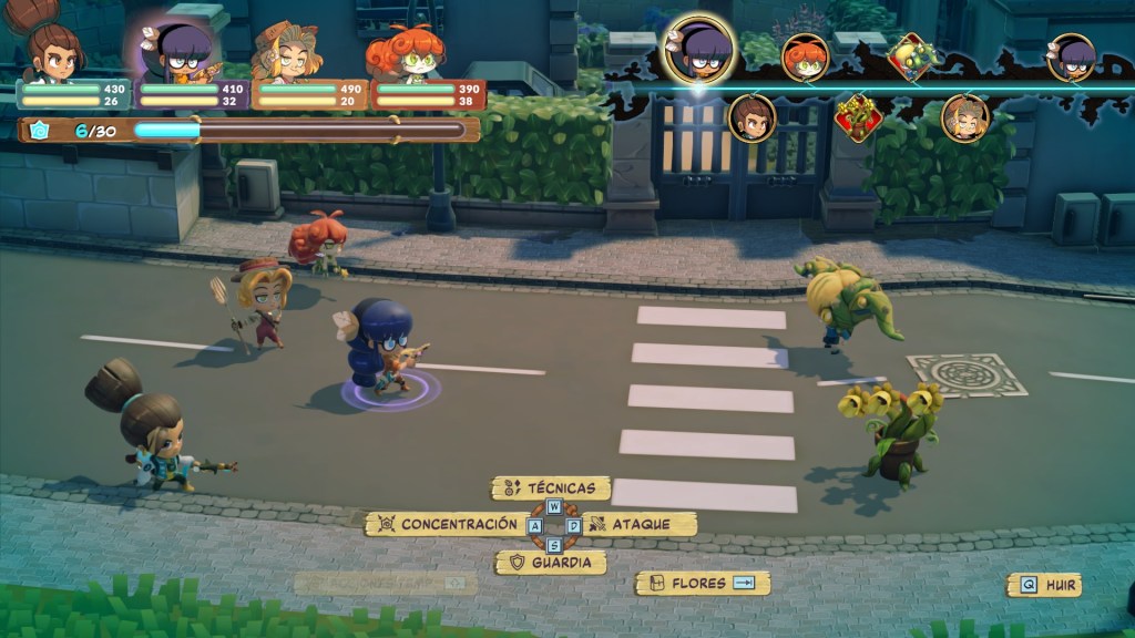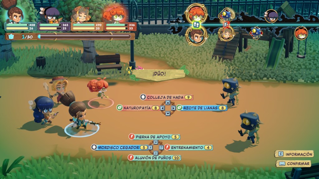 Sin embargo, y gracias a la Crono Mochila, podemos alterar el orden de los turnos, pudiendo retroceder en el tiempo para curarnos o adelantar para atacar en conjunto o atrasar los movimientos del enemigo.