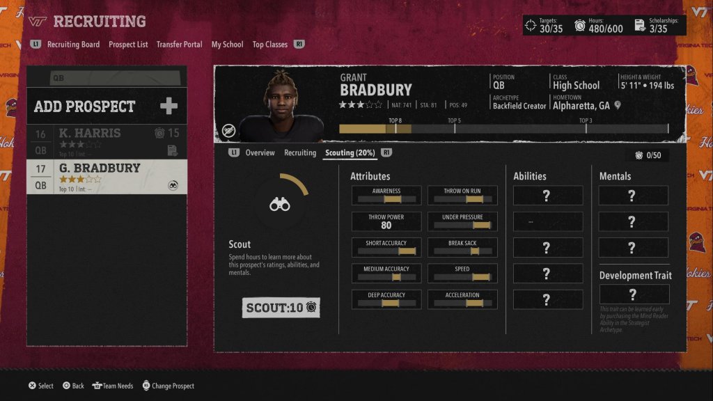 Esta vez el reclutamiento toma un aspecto aún más importante que el año pasado, primero deberás identificar cada uno de los prospectos, a través del scouting. Cuando tengas el 100% sabrás si el jugador se ajusta a tu universidad.