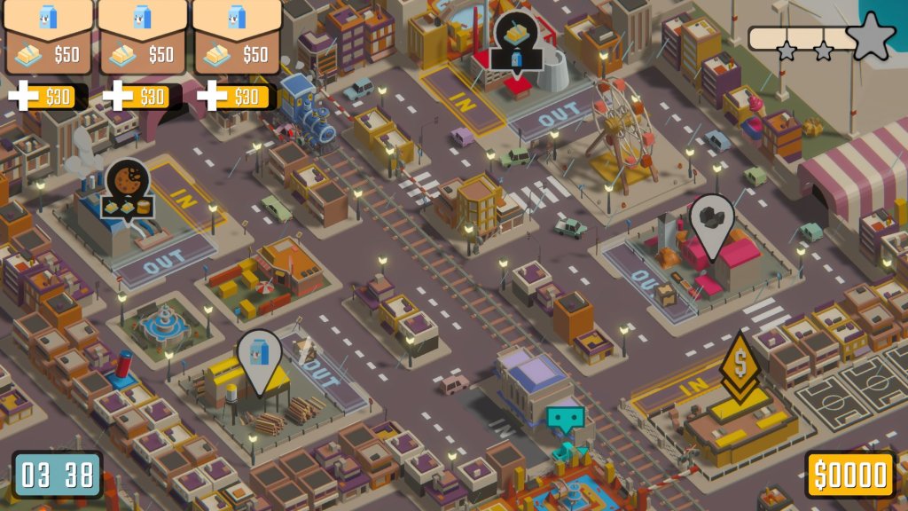 Lo importante es la velocidad, y si logras el bono por tiempo, mejor. Cada pedido completado te da dinero; entre más ganes, más estrellas acumulas, y estas abren nuevos escenarios para visitar. El típico avance de un árcade.