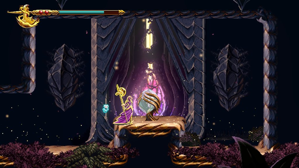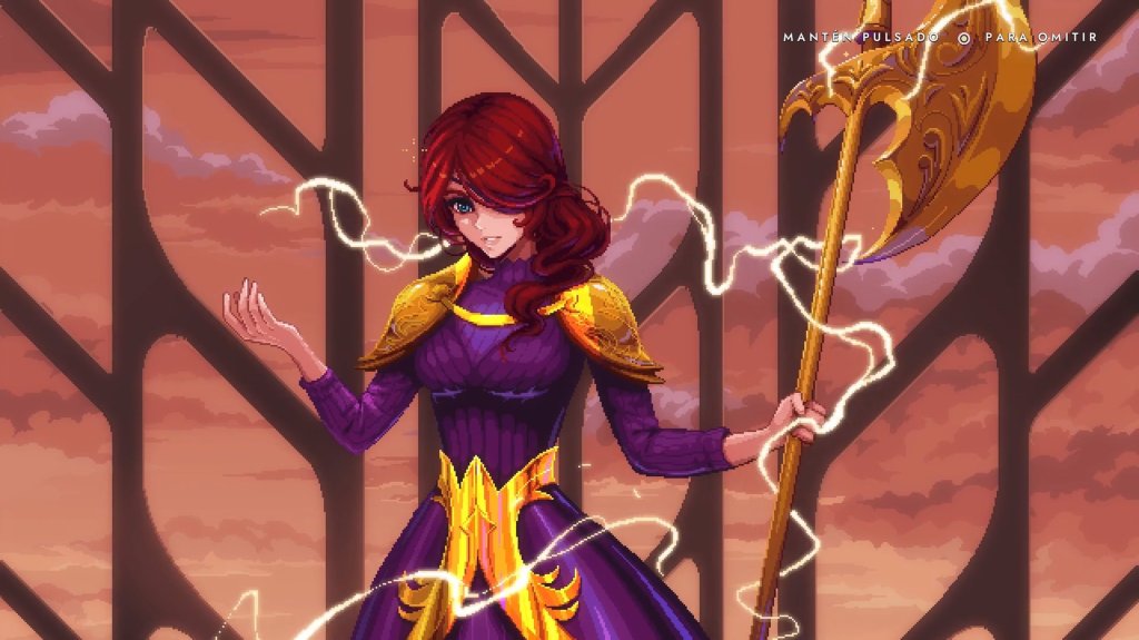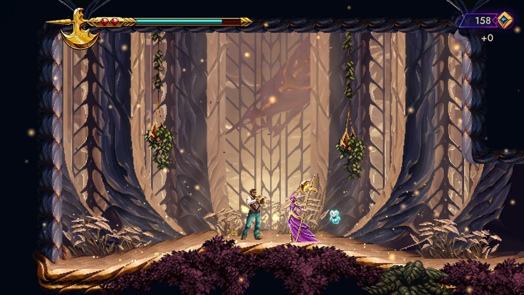 El estilo gráfico de 9 Years of Shadows maneja un detallado pixel art, lleno de ambientes coloridos y personajes muy bien diseñados. Cada escenario mezcla ruinas, naturaleza y magia con gran cuidado, generando atmósferas únicas que refuerzan la sensación de estar en un lugar lleno de misterios.