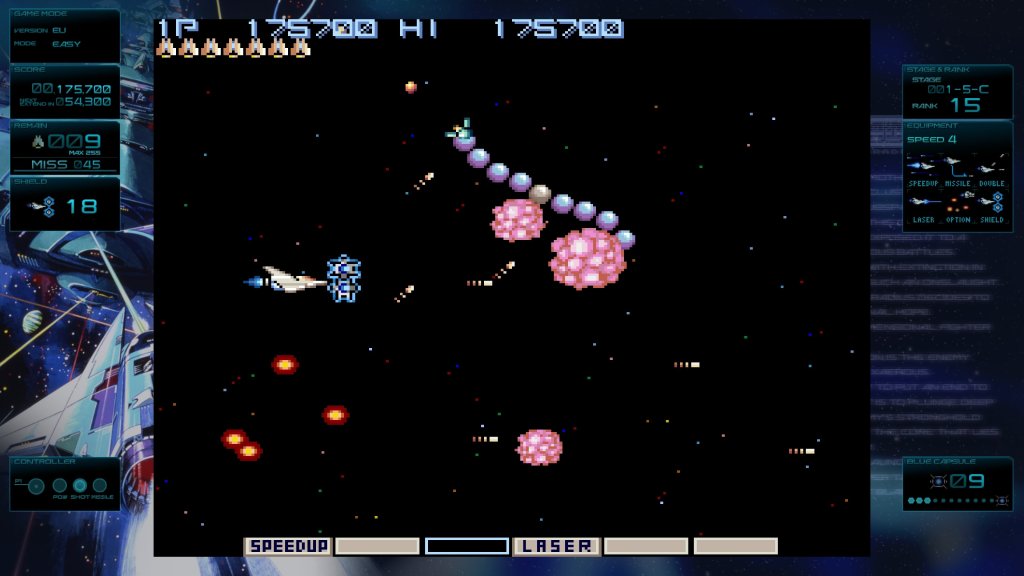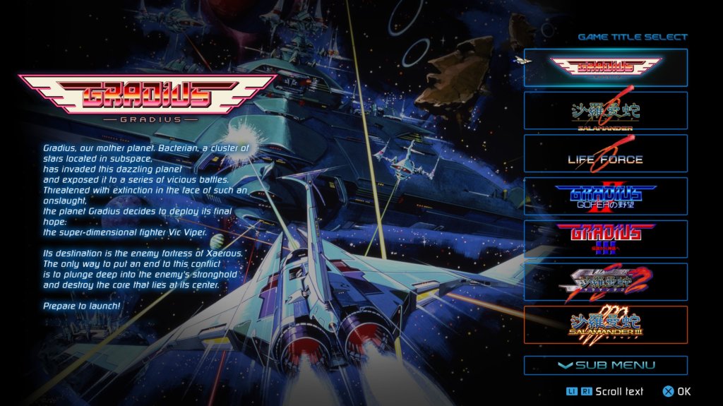 Gradius Origins incluye siete juegos fundamentales para cualquier fan de los shoot ’em up: Gradius, Gradius II: Gofer no Yabou, Gradius III, Salamander, Life Force, Salamander II y el inédito Salamander III. Lo impresionante es que no solo trae las versiones árcades originales, sino que suma versiones regionales, tanto japonesas, europeas y americanas, alcanzando un total de 18 juegos.