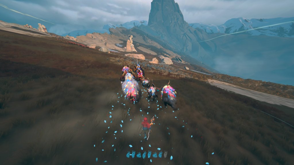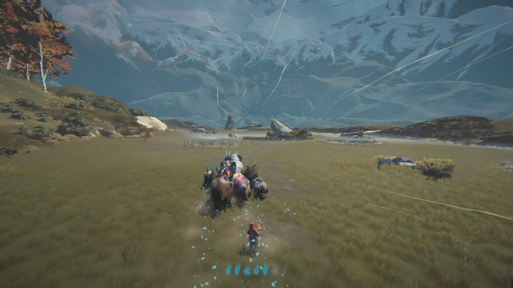 La banda sonora, con su aparición y desaparición sutil, magnifica cada momento del viaje. Hay silencios que te permiten concentrarte en lo esencial: guiar al rebaño y conectar con los calicornios. Luego, la música se vuelve épica cuando corres a toda velocidad escapando de una parvada de aves, solo para transformarse después en una suave y emotiva melodía que acompaña los instantes de descanso y ternura junto a tu manada.