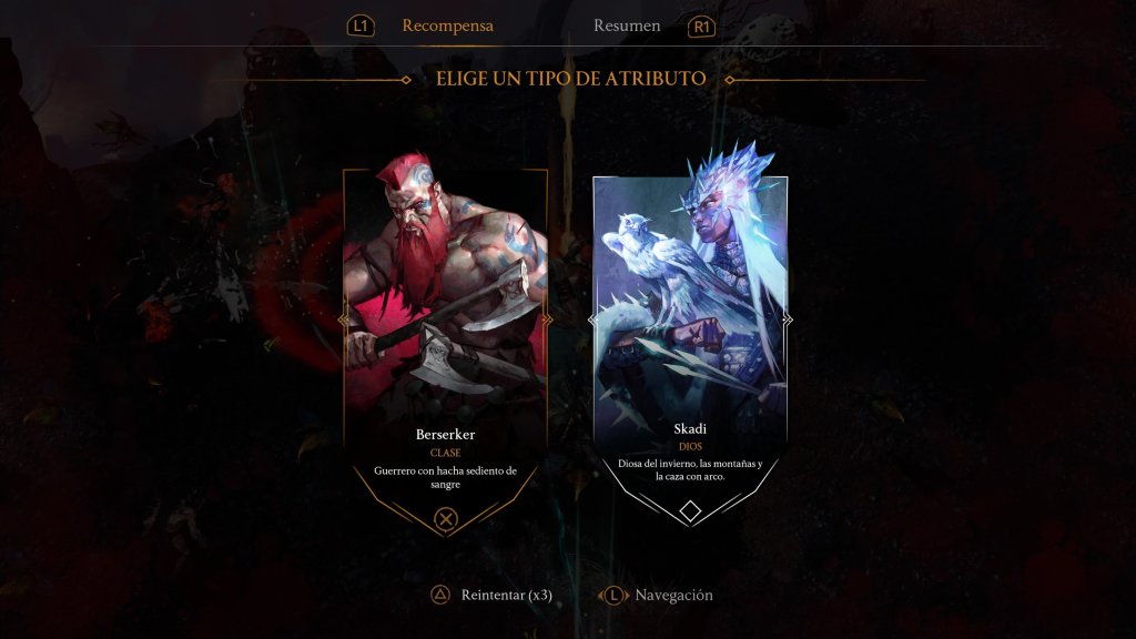 Hasta ahora tenemos lo básico de un survivor, pero hay dos cosas que hacen único a Jotunnslayer: Hordes of Hel. Primero, al subir de nivel tendrás la oportunidad de elegir una mejora de clase o un favor de los dioses; estos últimos vienen en forma de poderes especiales o de mejoras para tu personaje.