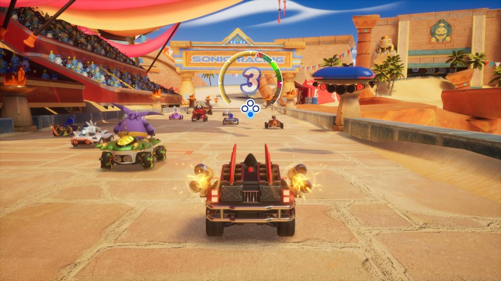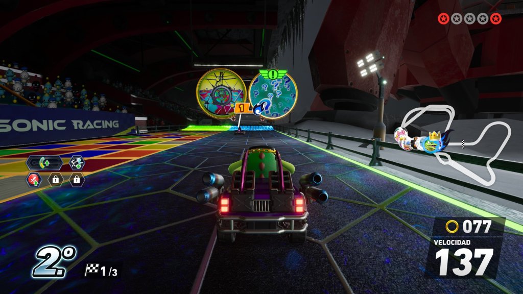 Visualmente, el juego es un festín de color y velocidad. Cada uno de los 24 circuitos principales está repleto de detalles que rinden homenaje a la historia de SEGA, con personajes y elementos icónicos en el fondo que reaccionan a nuestro paso. El salto entre dimensiones a través de los Travel Rings es casi instantáneo y resulta impactante: un momento estás en un circuito futurista y al siguiente terminas en la era Mesozoica, con dinosaurios que quieren comerte o aplastarte.