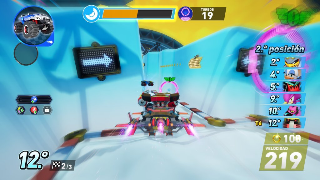 Hablando del garaje, allí también podrás agregar más de 70 ventajas pasivas a tu perfil de jugador, que se equipan en una placa de corredor. Estas van desde no perder anillos al golpear las paredes o iniciar la carrera con un potenciador, hasta mejorar tu estadística principal u obtener turbo al chocar contra tus rivales.