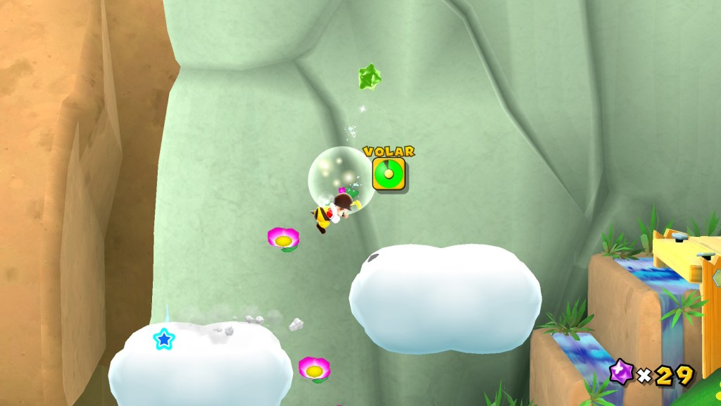 Al entrar en la partida, encontramos que cada mundo está pensando para ser explorado desde diferentes ángulos. Por lo que podremos jugar contra la gravedad en distintas ocasiones y divertirnos encontrando trozos de estrellas. Los cuales nos servirán para aturdir a los enemigos o engordar destellos y recibir recompensas.
