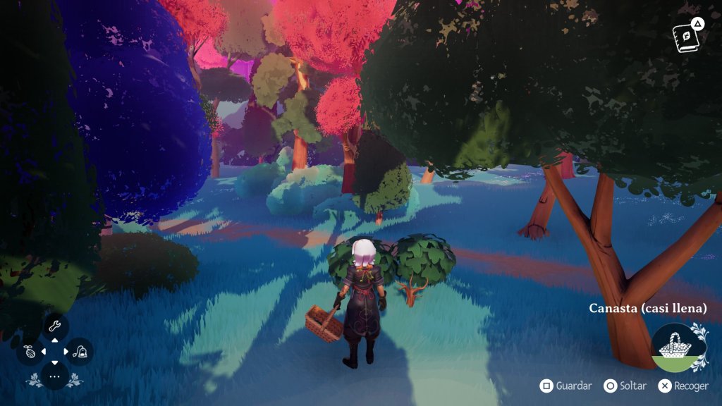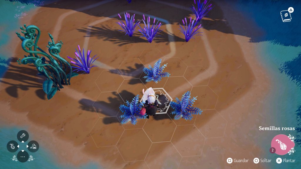 Para obtener frutos debes formar estructuras de cuatro flores, combinando colores para crear resultados distintos. Incluso puedes rodearlas de hongos y alterar los resultados, aumentando la cosecha o cambiando sus propiedades. Si no sabes que hacer, todo queda organizado en un manual que puedes ver al pulsar triángulo/Y.