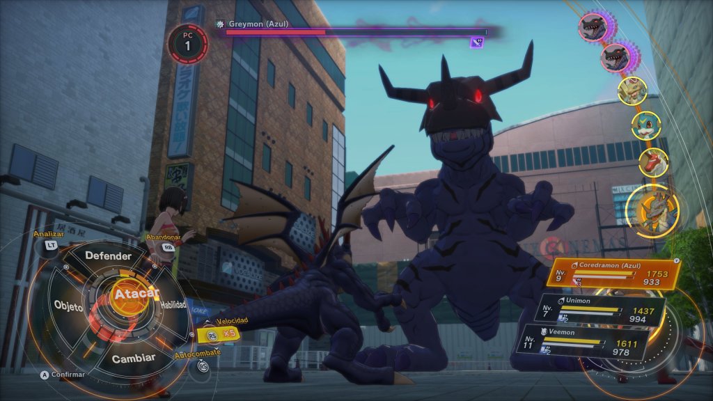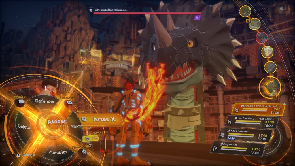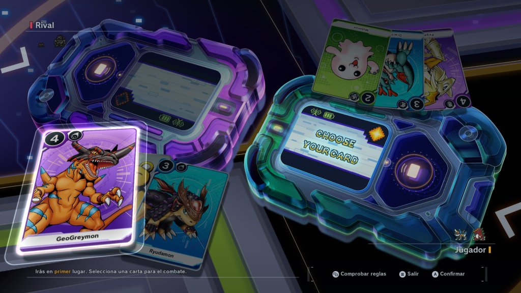 En batalla puedes llevar seis Digimon, tres activos y tres en reserva, y lo mejor es que cambiar entre ellos no consume turnos. También existe una habilidad especial llamada Cross Arts que puede generar ataques masivos o curaciones totales, pero esta habilidad se decide antes de iniciar la pelea.