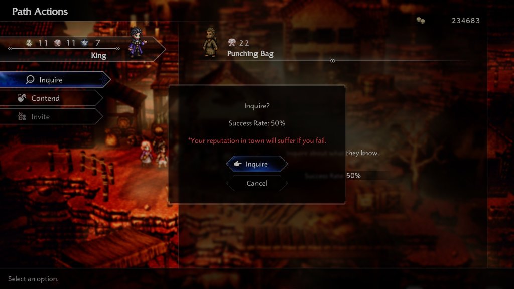 Al acercarte a un NPC, verás unos pequeños símbolos que muestran qué tipo de Acciones de la Senda puedes usar. Una lupa señala que el personaje está dispuesto a compartir más información sobre él o el mundo; una mano con monedas permite comerciar; dos manos juntas significan que puedes pedirle ítems; y, en algunos casos, incluso podrás desafiarlo a un combate para obtener objetos.