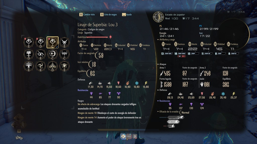 Esto genera una sobrecarga y cuando seas golpeado no solo perderás vida, sino también Icor, puntos que permiten usar tus Formas de Arma (habilidades) y tu ataque especial. Además, como podrás ver tengo varios parámetros que sobrepasan la mitad de cada sección de mi Código de Sangre. Esto hace que, en vez de esquivar con un paso rápido, haga una voltereta y sea más vulnerable.