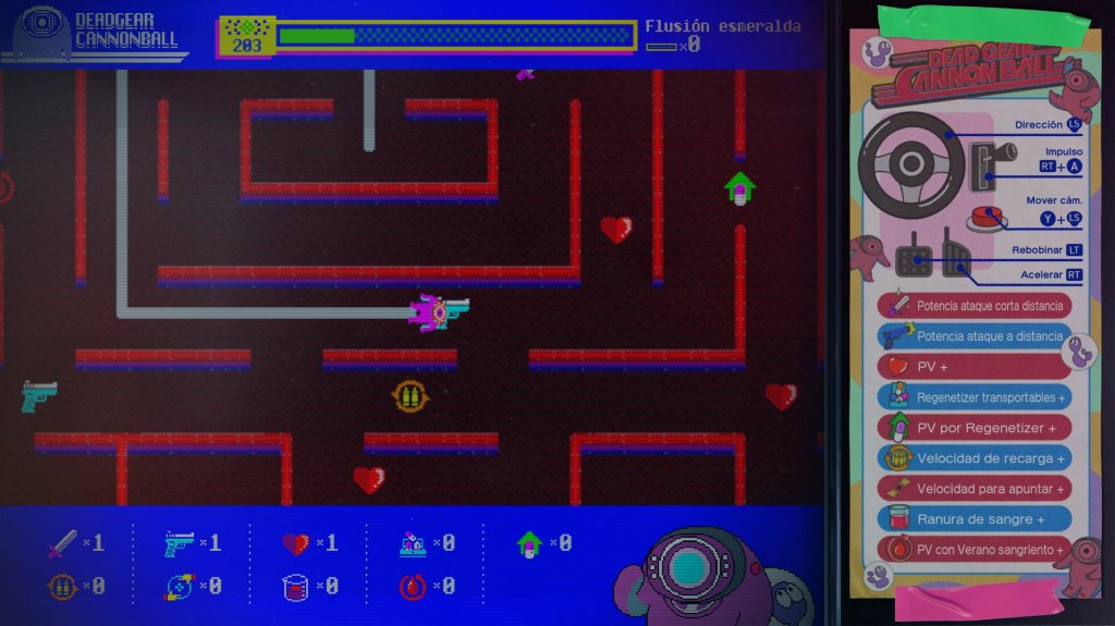 Esta será tu base de operaciones, donde para mejorar a Dead Man y hacerlo más fuerte usarás un juego retro tipo Pac-Man llamado Dead Gear Cannonball. Donde por cierta cantidad de Flusion Esmeralda (que sueltan los enemigos) te moverás, y si recoges potenciadores, Dead Man ganará más fuerza para sus ataques, más vida, recargará más rápido y absorberá más sangre.