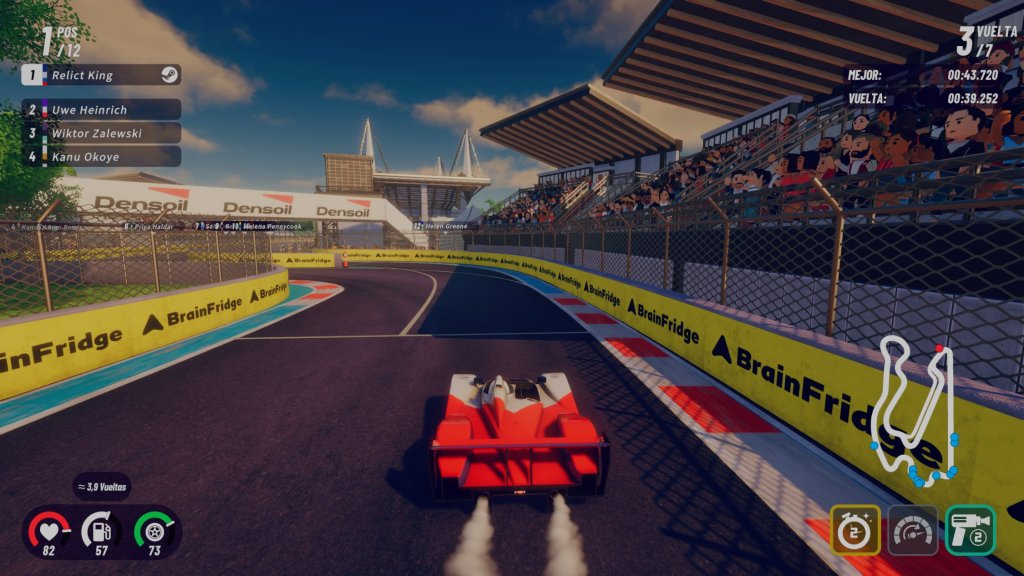 Ya en la pista estarás pendiente de tres elementos: la salud del coche, el nivel de gasolina y le desgaste de las llantas. Según la extensión de la carrera y qué tan bien conduzcas, entrarás a pits, esta mécanica es casi automática, pero recuerda no acelerar antes de que te llenen el tanque.