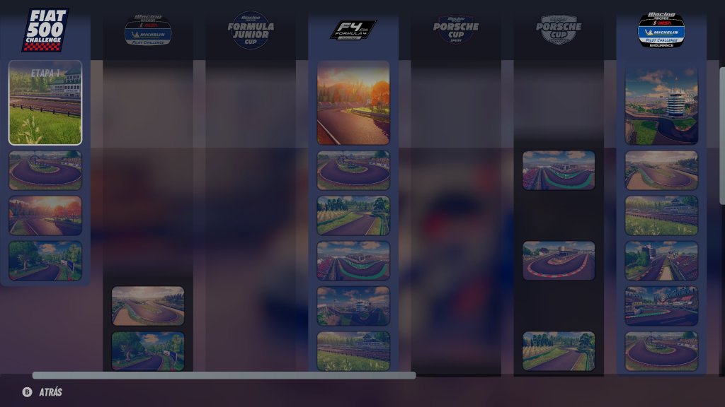 Allí iniciarás como piloto novato en la categoría Fiat 500 con autos que apenas sobrepasan los 100 kilómetros por hora. Luego de cada campeonato serás ascendido a una nueva categoría, pero también podrás seguir compitiendo en otras que ya hayas liberado.