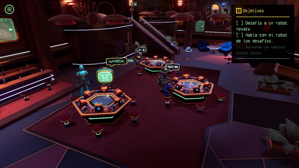Bajo la premisa de ser «la última línea de resistencia contra la supremacía de las IA», el juego nos sumerge en una atmósfera futurista donde simulamos ser robots en tableros de hasta seis jugadores.